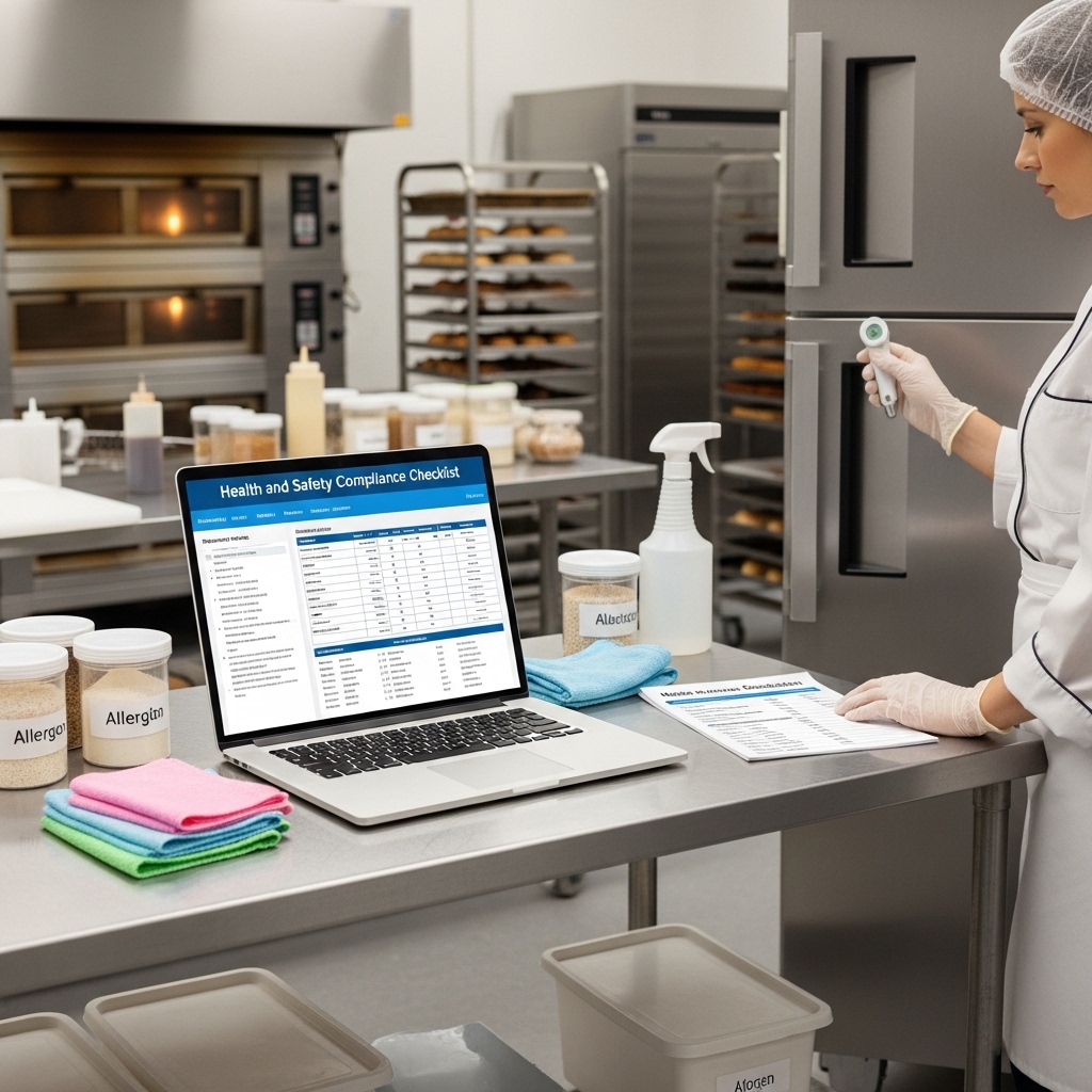 A comprehensive digital checklist designed to help bakery owners and kitchen managers maintain full compliance with food safety regulations and health inspection standards. Covers temperature logging for refrigeration and baking, allergen labeling verification, handwashing station audits, pest control inspection points, employee hygiene protocols, and cleaning schedule documentation. Aligned with common food safety frameworks and formatted for daily, weekly, and monthly review cycles. This checklist gives you peace of mind that your bakery meets or exceeds health standards while creating a documented trail that protects your business during inspections and audits.